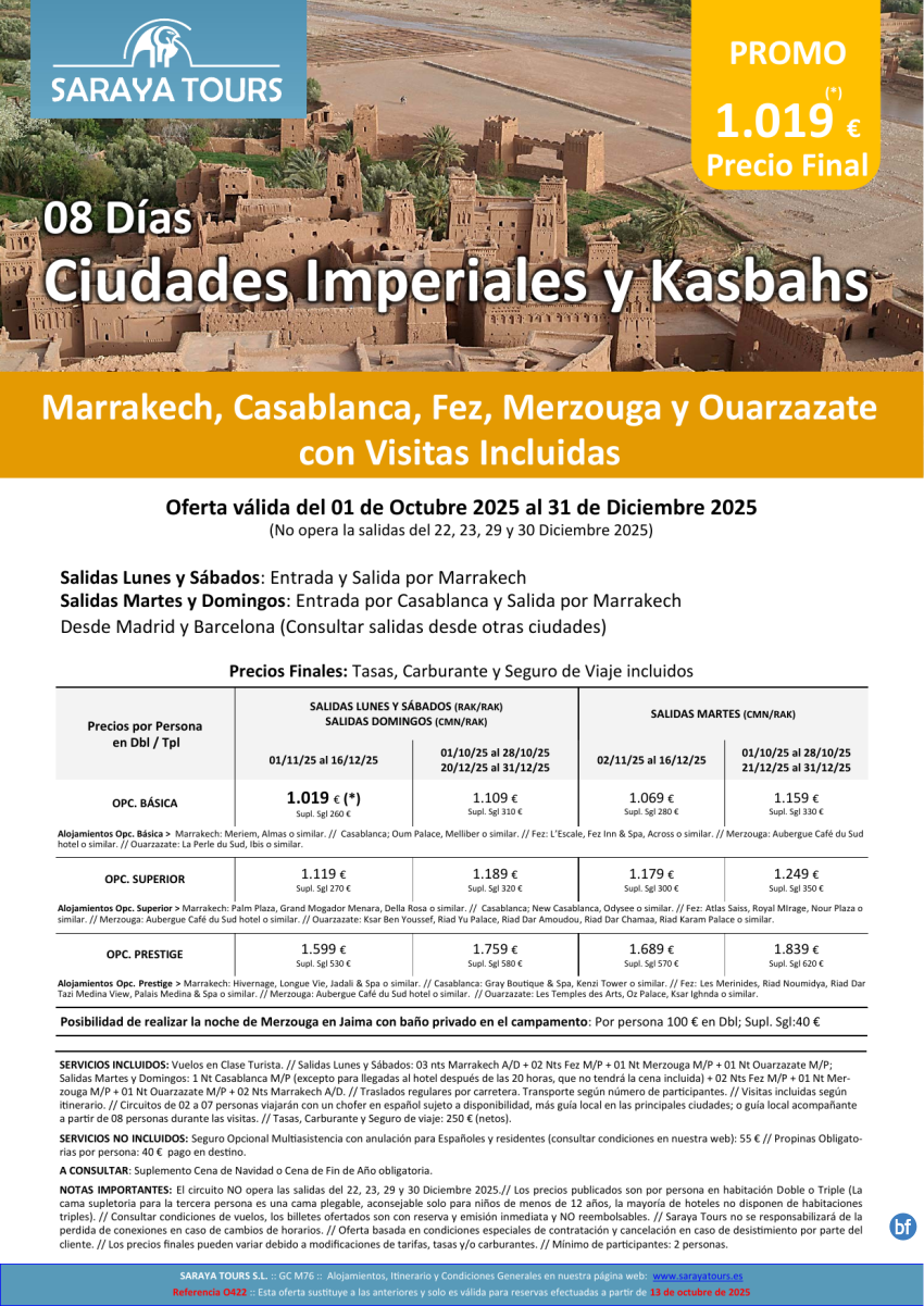 Ciudades Imperiales y Kasbahs 8 días con Visitas Incluidas: Rak, Cmn, Fez, Erfud, Ouarzazate hasta Diciembre26